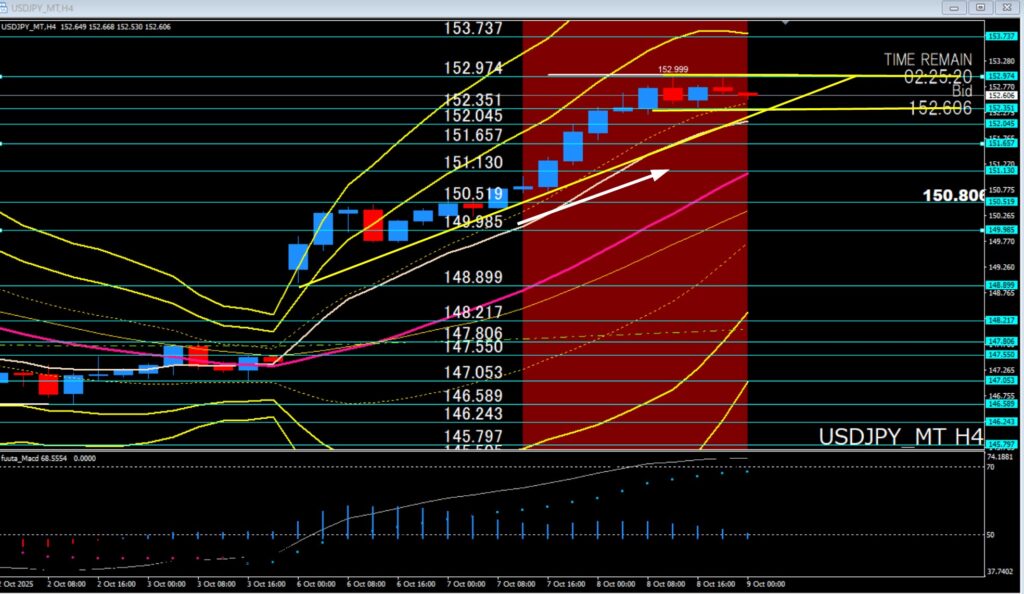 日足だと、昨日は高市トレード、円安継続で153円付近まで上昇もその後はNY時間も上値が重い展開にただ陽線が確定しています。