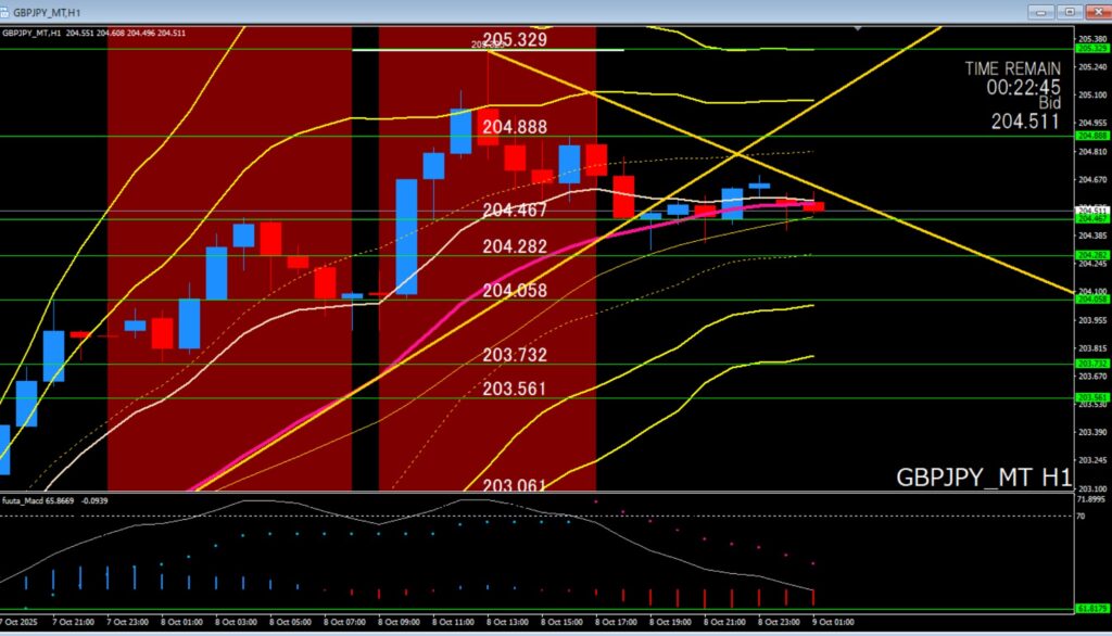 8時台になってから204円36付近から反発、買いが強まってきて60分足のミドルラインを超えていきそうです。