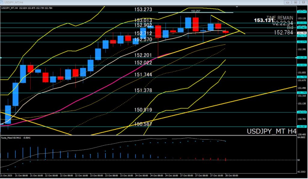 4時間足だと、ボリンジャーバンドがスクイーズ状態、MACDがデッドクロスしてきそうで、かつ、10EMAの下からのスタートで目崎は152円85付近で上値が重く下位足ではじり下げ展開中(7時台)、ミドルラインのある152円70付近でサポートされていますが下落しそうな状況です。