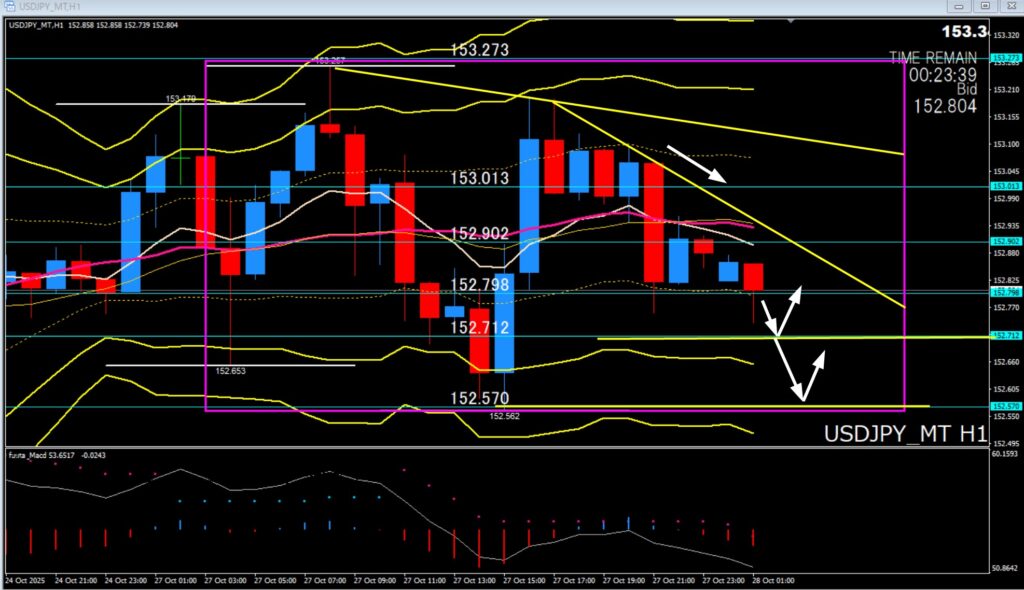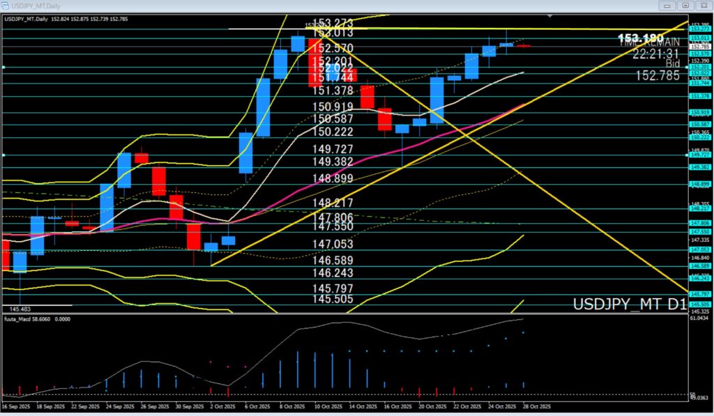 本日も152円60から50付近でサポートされていればまだ「横ばいから上目線」も、日足だとボリンジャーバンドの+1σのある153円00付近が抵抗線で上値が重ければやや下目線よりで戻り売りが優勢になる可能性もあり一旦は152円中盤までの下落は注意しておきましょう。