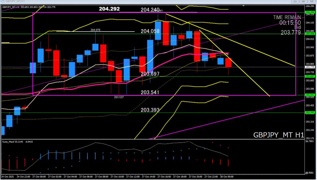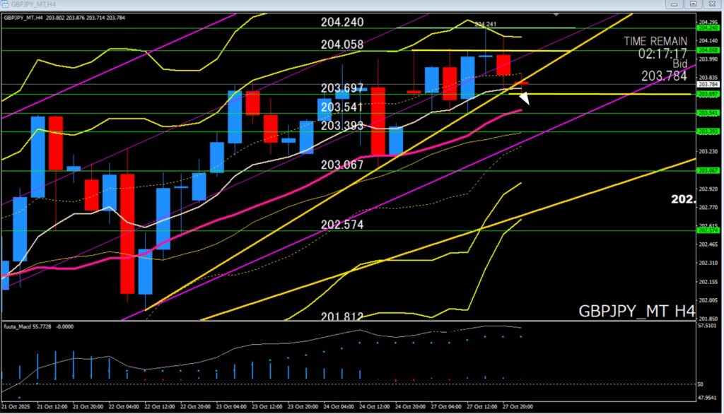 ●4時間足がまだ上目線の可能性があり買いも出てきますね!60分足は8時台もまだ下目線、反発するも203円82付近で上値が重い状況、ドル円もじり下げ展開が継続で東京時間はやや下目線に注意かなと考えています。