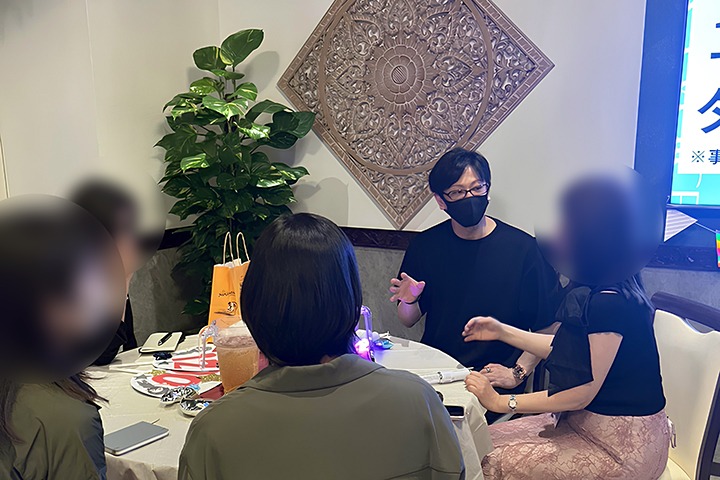 自己紹介タイムが終わると、食事を楽しみながらの交流タイム。女性の部と同様にふうたさんが順番にテーブルを巡回。雑談をする方もいれば、トレードのお悩み相談をしている方も。