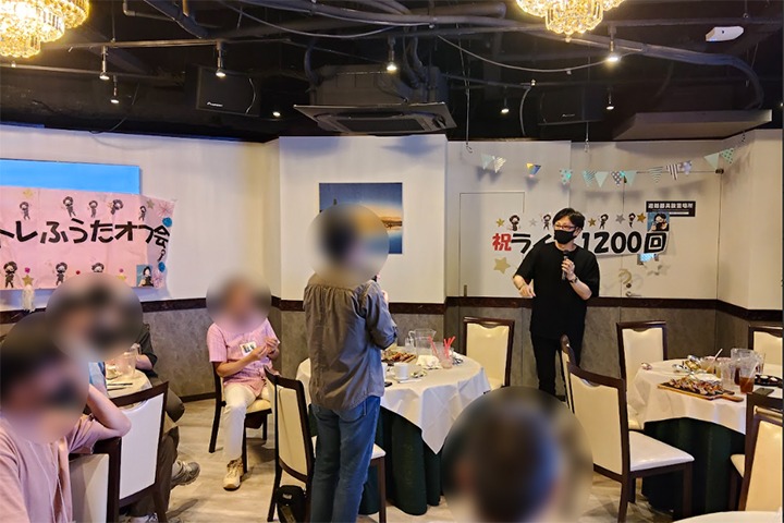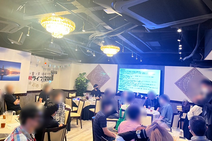 会場はいくつかのグループに分かれて着席するスタイル。開始時間になるとふうたさんが登場し、全員で乾杯した後はグループ内で自己紹介です。コメント欄でよく見かけるお名前もちらほら。